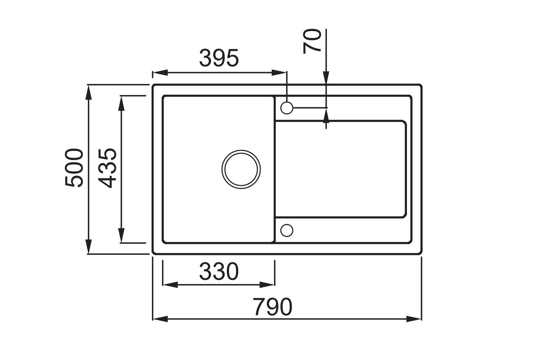 Integrovaná oblast pro příslušenství v odkapávači, vybavená předvrtanými otvory, které vám umožňují instalovat doplňky: excentrické ovládání odpadu, dřezovou baterii s vytahovací sprchou a dávkovač saponátu.