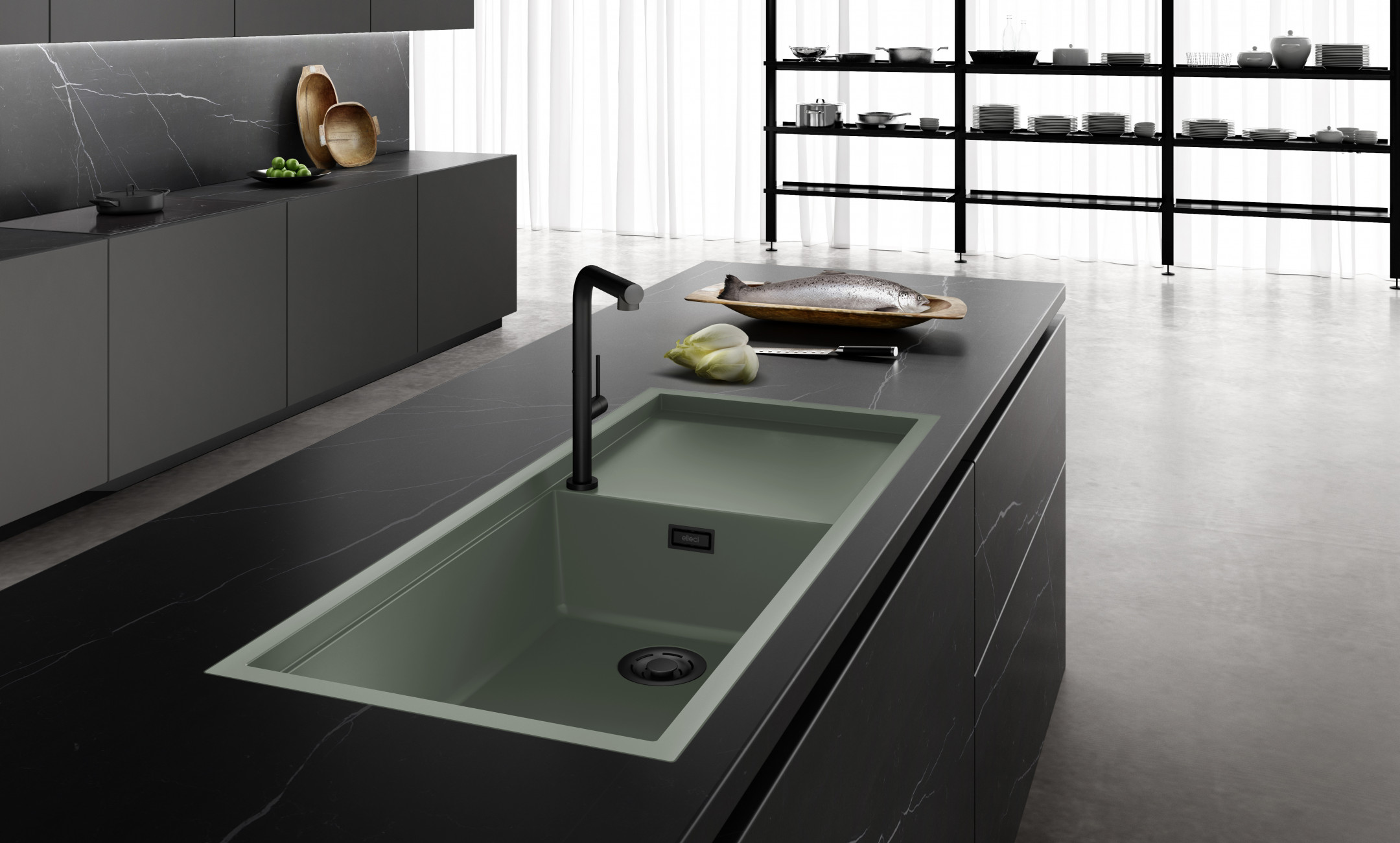 Modelová řada SINTESI nabízí jak montáž dřezu shora, ale také montáž do pracovní desky. Dřez "zapuštěný" do pracovní desky se lépe udržuje, SINTESI má také více zapuštěnou odkapovou část, voda se tak nedostává na pracovní plochu.