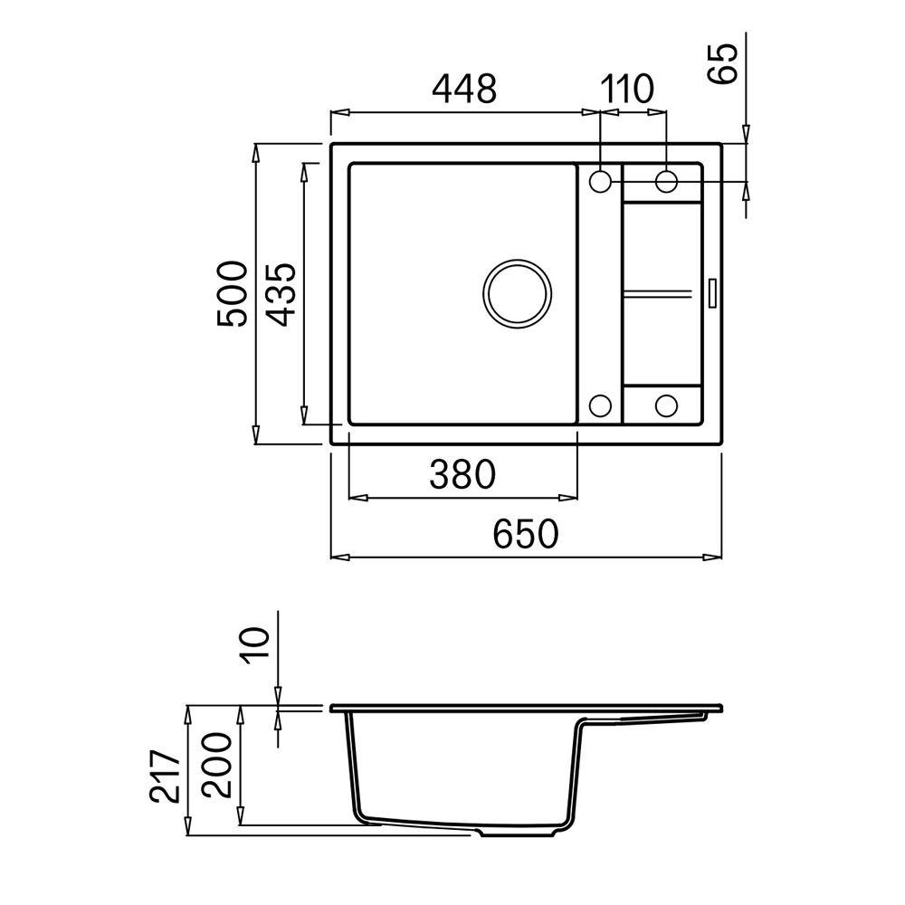 Integrovaná oblast pro příslušenství v odkapávači, vybavená předvrtanými otvory, které vám umožňují instalovat doplňky: excentrické ovládání odpadu, dřezovou baterii s vytahovací sprchou a dávkovač saponátu.