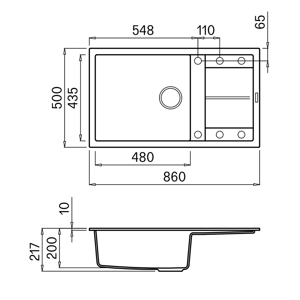 Integrovaná oblast pro příslušenství v odkapávači, vybavená předvrtanými otvory, které vám umožňují instalovat doplňky: excentrické ovládání odpadu, dřezovou baterii s vytahovací sprchou a dávkovač saponátu.