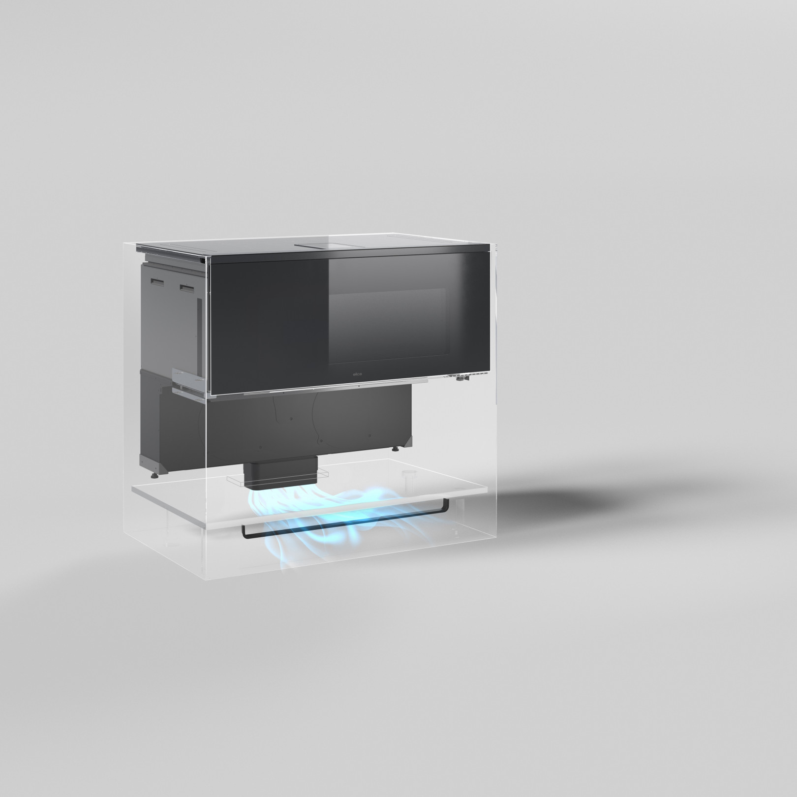 Filtrovaný vzduch je směrován do soklu a difuzně vychází přes ventilační otvor, který může být zakončen chromovaným profilem.