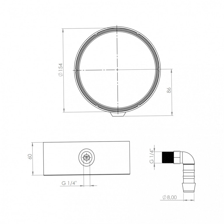 Jímka je vybavena trubkovým závitem G 1/4”, který je možné napojit, při vhodném zredukování, na jakýkoliv vodovodní systém. Pro usnadnění montáže je jímka dodávána s 90° kolenem, na které je možné připojit hadici s otvorem o průměru 8 mm.