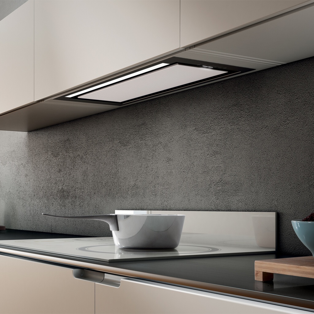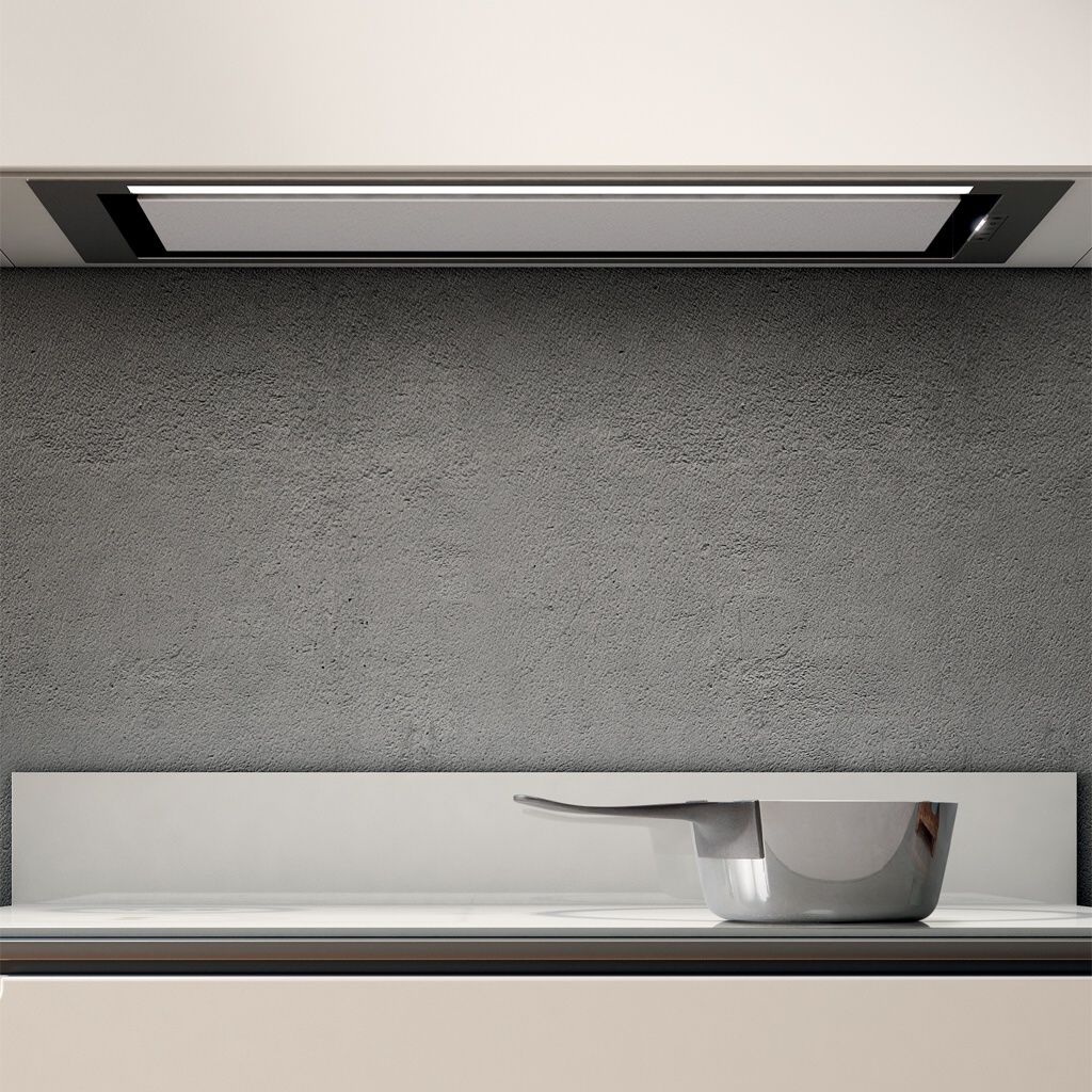 ELICA HIDDEN je vestavný odsavač par (digestoř), je vyroben z nerezové oceli a bílého bezpečnostního skla. Odsavač par s výkonem 300-600 m3/h a v intenzivním výkonu až 700 m3/h, s hlučností 51-70 db (A). Systém PERIMETRICKÉHO sání umožňuje zvýšit rychlost, s jakou jsou zachyceny výpary z vaření, což zvyšuje účinnost odsavače. Užitečnou funkcí je TEMPORIZACE . Po aktivování této funkce se odsavač automaticky vypne se zpožděním.