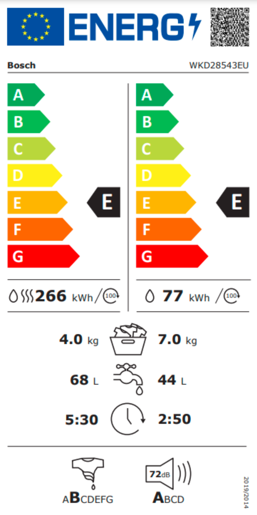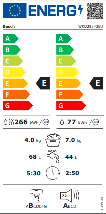 WKD28543EU Výkon a spotřeba třída energetické účinnosti praní a sušení1: E třída energetické účinnosti praní2: E energie3 / voda4 praní a sušení: 266 kWh / 68 l energie5 / vod ...Více informací