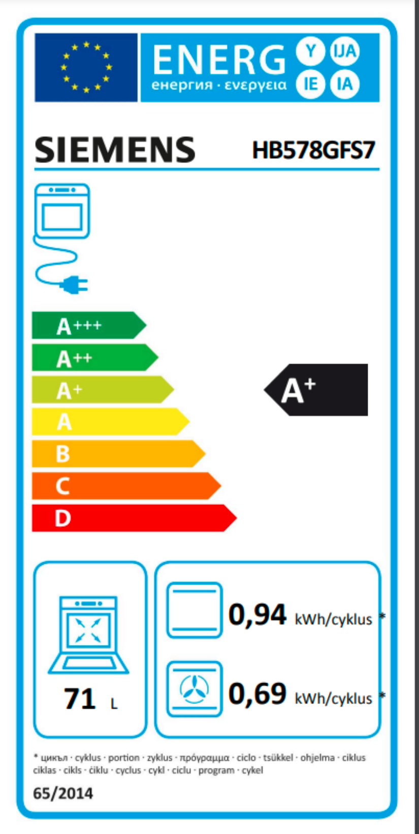 spotřeba energie na cyklus při konvenčním ohřevu:0.9 kWh(na stupnici třidy energetické účinnosti od A+++ do D)