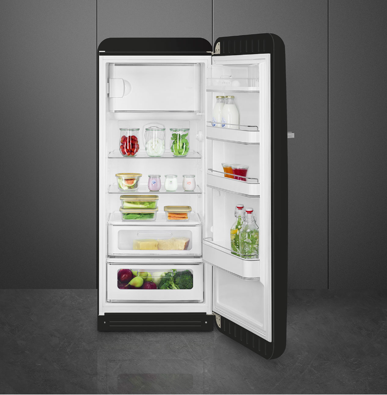 Barevné chladničky FAB28 se staly kultovním předmětem a ztělesňují styl a kreativitu. Interiér je také prezentován ve stylu 50. let, s oblými tvary a harmonickými proporcemi.