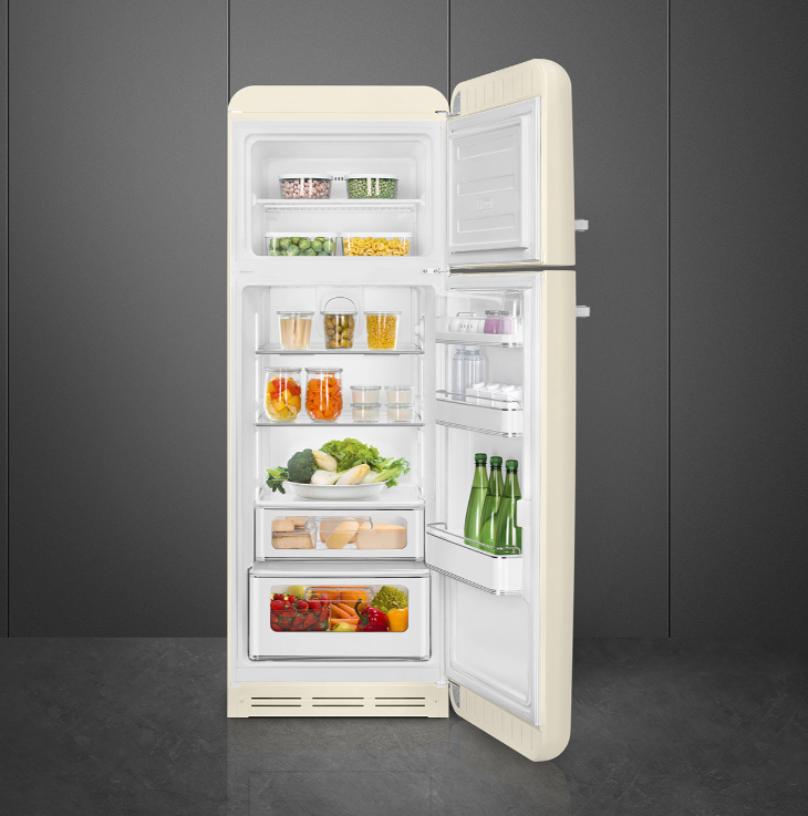Chladnička značky Smeg ve stylu 50. let vytváří akcenty v kuchyni i kanceláři. Volně stojící chladničky jsou považovány za ikony stylu kvůli svému retrodesignu ve stylu 50. let, zaboleným liniím a vyklenuté přední části. Skvělým příkladem je svolně stojící chladnička s mrazicím prostorem FAB30. Kombinovaná chladnička o šíce 60 cm nabízí chladicí prostor o celkovém užitném objemu 229 litrů, který je doplněn mrazicím prostorem o objemu 72 litrů. Mrazicí prostor se nachází v horní části spotřebiče a má identický vzhled.